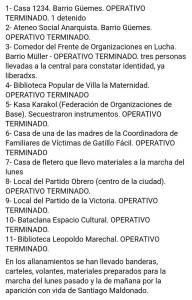 El operativo policial fue sincronizado y ordenado por el fiscal Gustavo Dalma. El resultado: allanaron siete organizaciones sociales, dos domicilios particulares y dos partidos políticos opositores (PO y Partido para la Victoria), en los que secuestraron cajas con leche, bombos y redoblantes de murga, banderas con los rostros de chicos acribillados por gatillo fácil y afiches con la cara de Santiago Maldonado.