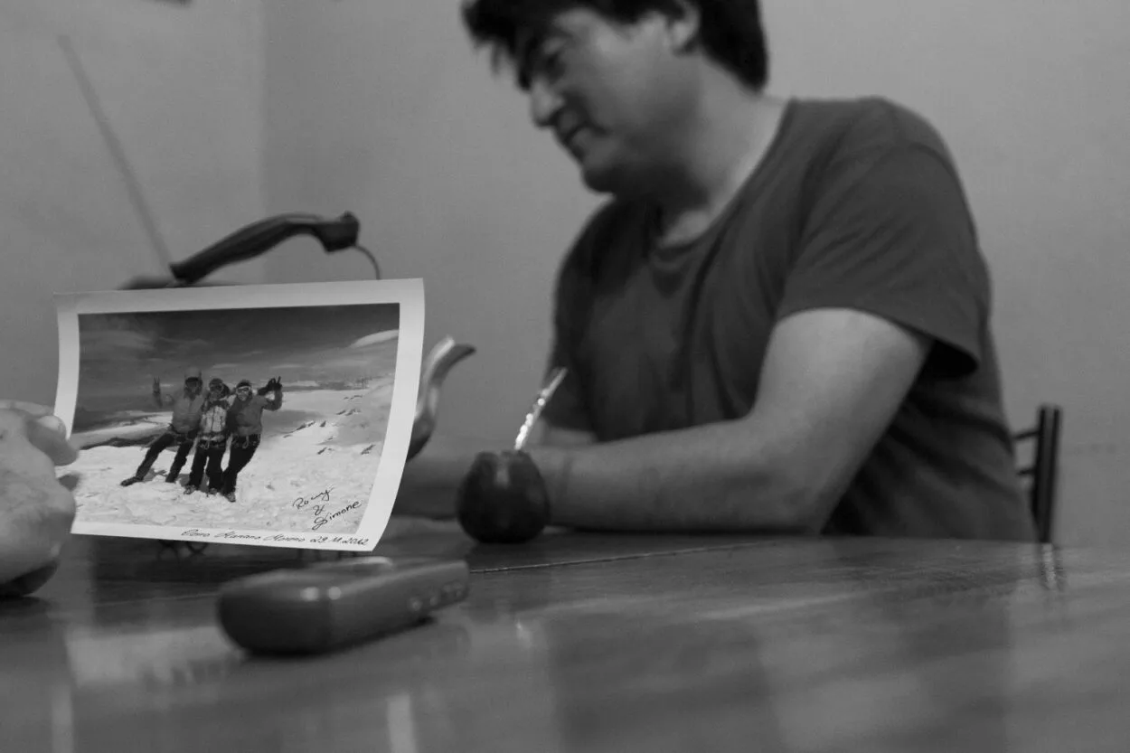 Es ancho de espaldas y amaga agacharse para pasar por el dintel de su puerta. Morocho y de ojos achinados. El derecho aún más por un accidente que tuvo hace 3 años volteando un árbol. Desde esa época no puede escalar y mientras espera poder operarse la retina se dedica a la construcción y a la poda con su hermano. No ir a la montaña lo pone triste dice, cuestión que está por cambiar ahora que volverá a trabajar como refugiero en el Jackob, lugar que ocupó desde los 16 años.