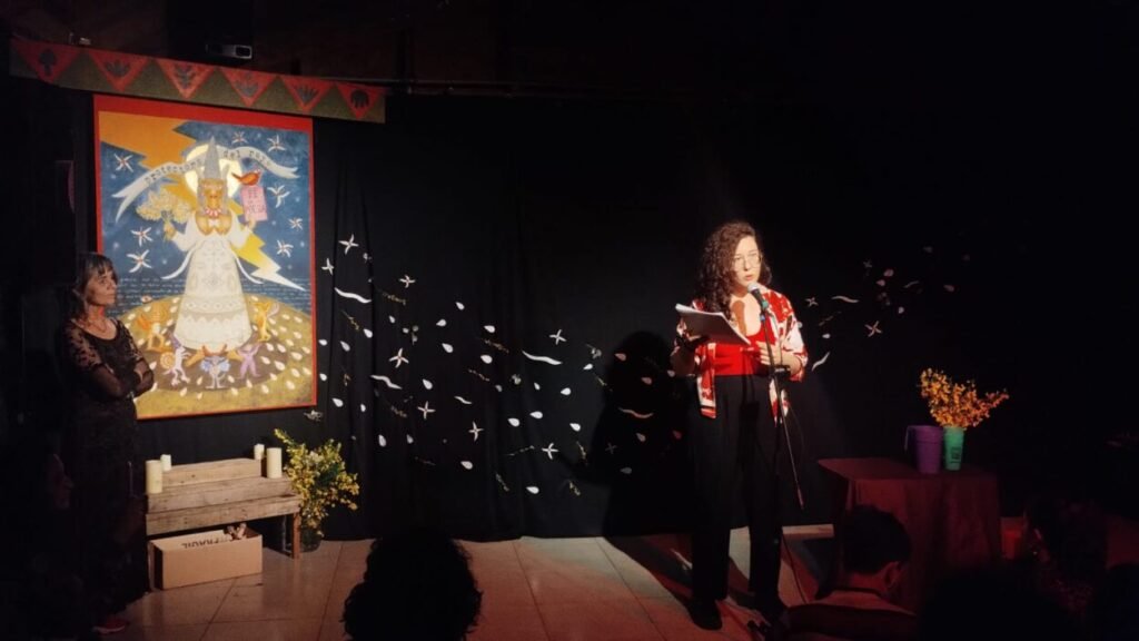 “Avanza la ultraderecha en el país y en el mundo, abundan los discursos de odio, la indiferencia en todos los niveles, el sálvese quien pueda, el uso degradado de la palabra que tiende a automatizarse, a banalizarse, a polarizarse. Y qué hace la poesía contra los grandes poderes del mundo: posiblemente nada”, dice Lola Halfon frente al silencio contenido del público expectante.