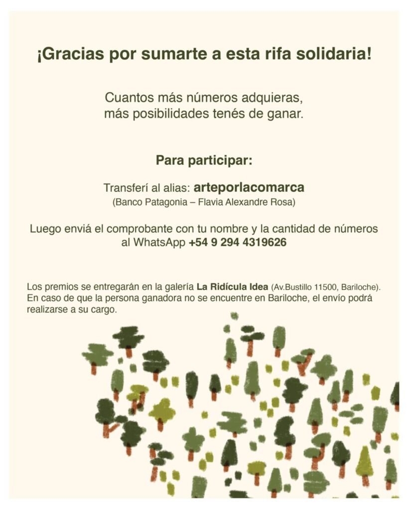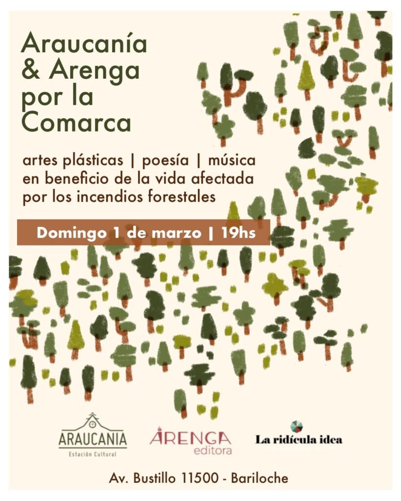 Este domingo 1 de marzo desde las 19 horas tendrá lugar en el kilómetro 11,500 un evento de artes plásticas, poesía y música a beneficio de los damnificados por los incendios forestales. La actividad es gratuita y para colaborar se puede adquirir una rifa solidaria: lo recaudado será donado a Amigos de la Patagonia y Circuito Verde.