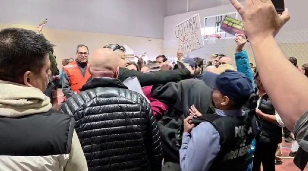 En medio de ese descontrol una mujer que llevaba un cartel que decía “CATEDRAL NO SE TOCA. NO SE VENDE. NO SE ENTREGA” recibió un golpe en la cabeza que le provocó un desvanecimiento. Se trata de Vilma Castagnetto, de una asamblea de jubilados. Fue asistida en el lugar por personal de Protección Civil y luego debió permanecer varias horas en observación en un hospital. Además, hizo una denuncia policial.