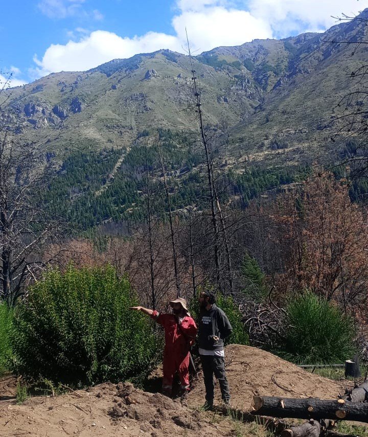 “Me mudé definitivamente acá hace tres años, después de sentir un impulso muy profundo de tener que venir a defender la tierra, porque creo que pertenece a quien la trabaja y quien la cuida. No a quien la puede pagar”, señala Nahuel, y cuenta que el día en que el fuego llegó a la Rinconada, en enero del 2025, tanto él como su padre y hermano estaban en El Hoyo: “Nos avisaron que había un foco cercano a las once de la mañana y para las tres de la tarde estaba en todo el pinar de enfrente. Llegamos, empezamos a mojar todo, a prepararnos por si llegaba el fuego. La verdad es que no sabés qué hacer en esa situación, qué rescatar y qué dejar. De pronto el fuego cruzó el arroyo, subió por el pinar y ya no podíamos salir. Sacamos todo lo valioso y lo cargamos a la camioneta, que mi hermano bajó al arroyo, donde hay una pampita. Teníamos los ahorros y nuestros cinco perros adentro de la camioneta. Con mi viejo nos quedamos intentando salvar la casa a baldazos. Cuando no tuvimos más que hacer bajamos al arroyo, pero ya estábamos encerrados por el fuego. Soplaba un viento de 70 kilómetros por hora. Cuando llegamos abajo, la camioneta ya estaba ardiendo. No pudimos sacar nada. Nos salvamos porque nos metimos en el arroyo, con lo puesto, en un lugar donde hay un paredón de agua”.